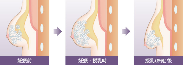 バスト変化の原因、それは乳腺にあります。妊娠すると女性ホルモンが通常の何十倍も分泌され、乳腺組織が増大。授乳期にはそこに母乳も蓄えられるため、人生で経験のないMAXのバストサイズに至るのです。