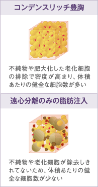 今や豊胸術の主流となった脂肪注入豊胸ですが、なかでもコンデンスリッチ豊胸は採取した脂肪をそのまま注入するのではなく、濃縮された良質な脂肪細胞と幹細胞を注入します。不純物や肥大化した老化細胞を徹底除去しているので、従来の脂肪注入法よりも定着に有利に働く細胞を多く注入することが可能。皮膚の伸展も脂肪の定着に関係するため、皮膚が伸びている産後・授乳とのバストでは、特に高い効果が期待できます。