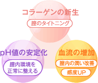 高周波の熱エネルギーにはコラーゲンの新生・増殖作用がありますが、サーミバーは施術中、コラーゲン新生に最適な40~45℃をキープすることができます。これにより膣内が引き締まり、尿漏れやお湯漏れを改善。また、新陳代謝で膣内環境が整うことで、膣粘液の再生やpH値の正常化が期待できます。外陰部のたるみや黒ずみにも効果的です。